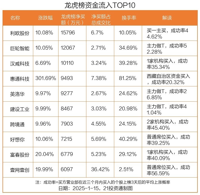 1月15日,上证指数下跌0.43%,深证成指下跌1.03%,创业板指下跌1.82%。盘后龙虎榜数据显示,共有50只个股因当日异动登上龙虎榜,资金净流入最多的是利欧股份(002131.SZ),达1.58亿元。