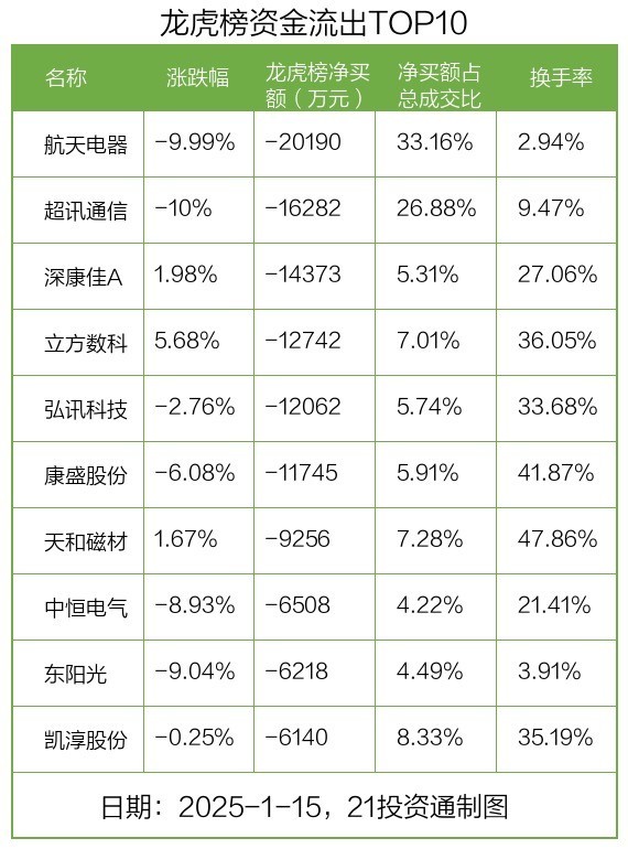而龙虎榜中资金净流出最多的是航天电器(002025.SZ),被净卖出为2.02亿元,占总成交金额的33.16%。航天电器收盘下跌9.99%,换手率为2.94%。