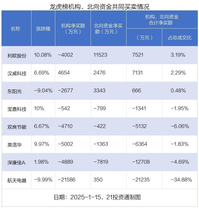 值得注意的是,机构和北向资金共同净买入了汉威科技;共同净卖出了双良节能、宝鼎科技、英洛华、深康佳A等4股;在利欧股份、东阳光、航天电器上出现分歧,机构净卖出利欧股份4002.16万元,北向资金净买入1.15亿元;机构净卖出东阳光2676.57万元,北向资金净买入3342.63万元;机构净卖出航天电器2.16亿元,北向资金净买入350.49万元。