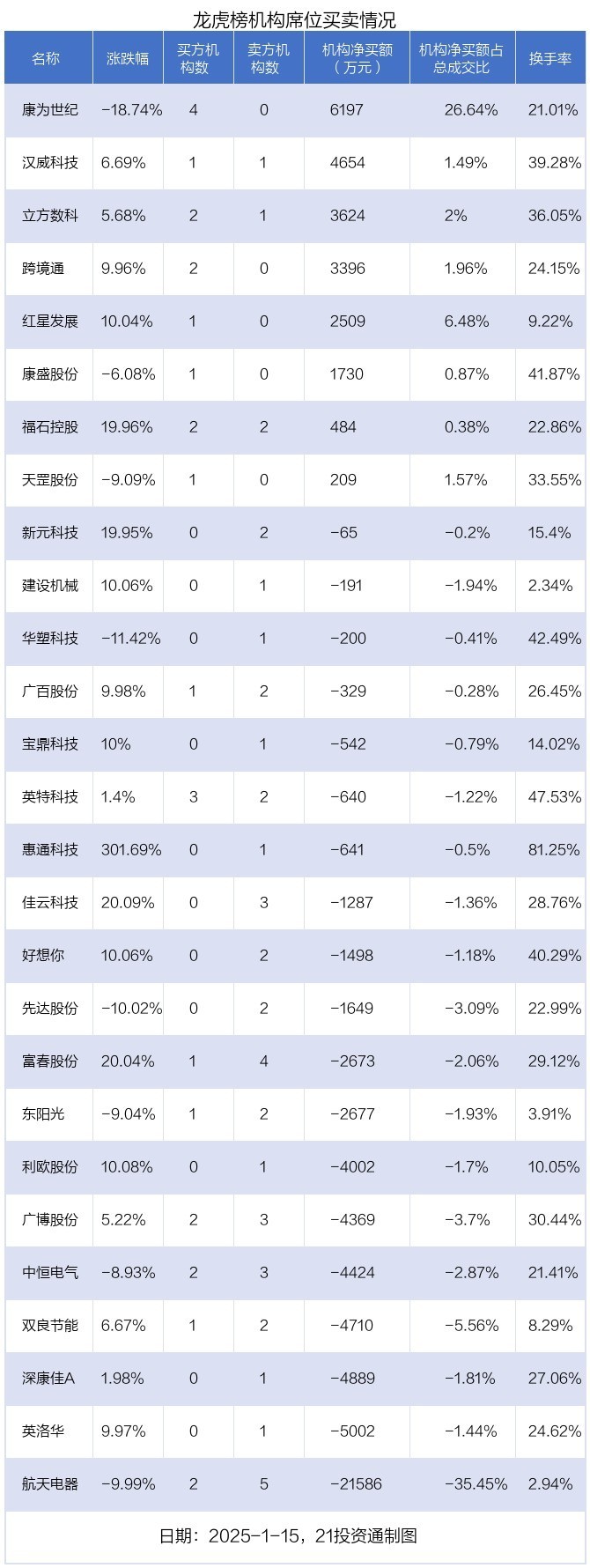 其中,机构净买入金额最多的是康为世纪(688426.SH),当日收盘下跌18.74%,换手率为21.01%。